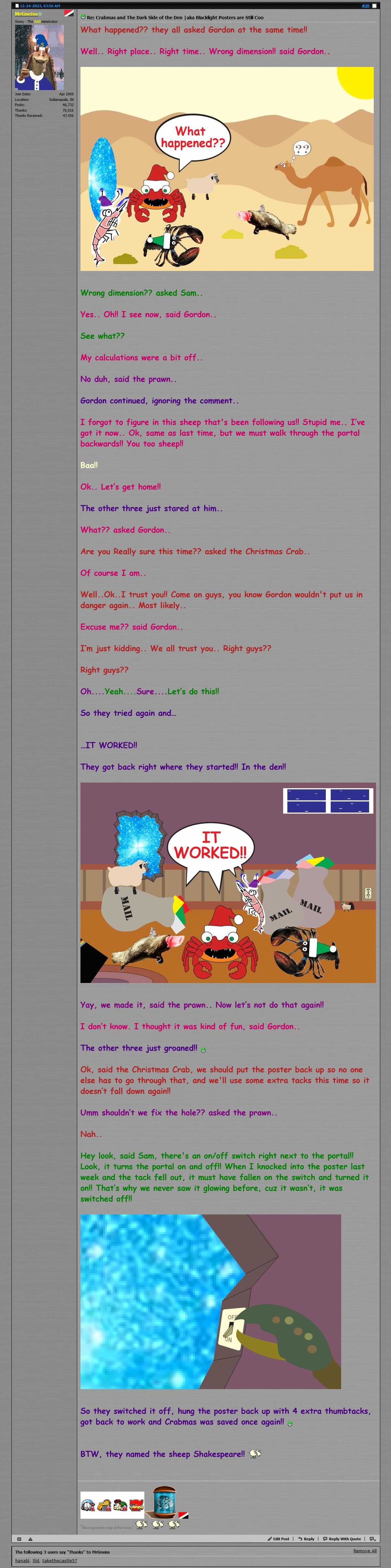 One new thing we learn about is Gordon's GPS!! Some of the graphics I actually like are the 3Dish portal in the wall and the stars over Christmas Crabs head in the American Gladiator part, and no, I have no clue where the idea to go to the American Gladiator set came from, most likely just another random thought like usual!! :-D Probably where the idea for the blacklight posters came from too and yes, they are indeed still cool!! The one thing I do remember is why there's a France bit in the story, I wanting to have something from Paris in this story since I was already getting ready to go to the Paris Olympics the next year!!